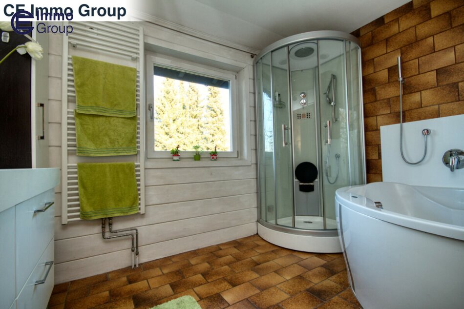 Das Einfamilienhaus verfügt über drei Schlafzimmer im Erdgeschoss. Das Badezimmer mit Dusche und Badewanne sorgt für den optimalen Wellnessfaktor. Wer würde hier nicht gerne abends mit Wohlfühlmusik in dieser Wanne relaxen?