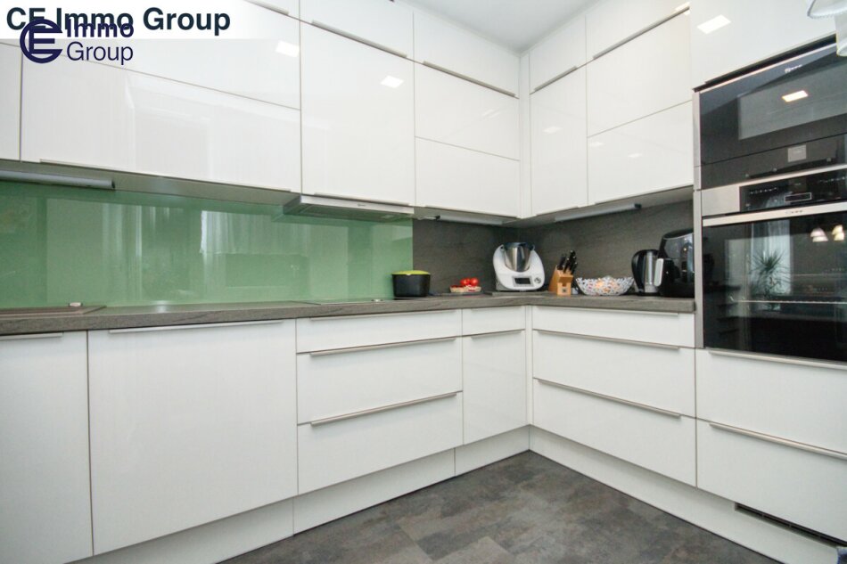 Die wunderschöne DAN-Küche mit NEFF/BOSCH Geräten und weißen Hochglanz Fronten ist im Kaufpreis inbegriffen. Der direkte Durchgang zu beiden Terrassen ermöglicht somit perfektes Ambiente für Profigriller und Hobbyköche. Platz genug in der Küche, im Essbereich und auf den Terrassen.
