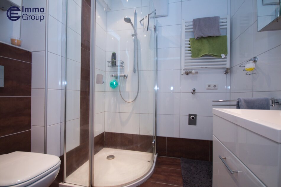 Das Badezimmer verfügt über eine moderne Eckdusche, Handtuchheizkörper und WC.
